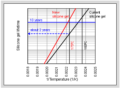 要保证模块有高的操作结温,在高温下,硅凝胶的可靠性必须要得到保证。富士电机开发的新硅凝胶在高温环境下放置(215°c,2000小时)没有出现裂纹。图4为环境温度和硅凝胶使用寿命的关系。横轴是环境温度(数值越小,温度越高)、纵轴表示硅凝胶的寿命。在175℃下高耐热硅凝胶的使用寿命比传统的硅凝胶提高了5倍,并且寿命在10年以上。因此,确保了X系列模块在175℃的高温下绝缘性能可以与传统产品在150℃条件下的绝缘性能具有相同的可靠性。