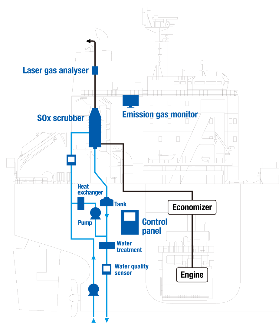 我们的EGCS将SOx洗涤器与烟气分析仪相结合,实时测量废气中的物质浓度,并带有逆变器和控制器,控制吸收海水的给水泵。该洗涤器效率超过98%,同时还可以用于含硫量限值为0.1%的各监管海域。