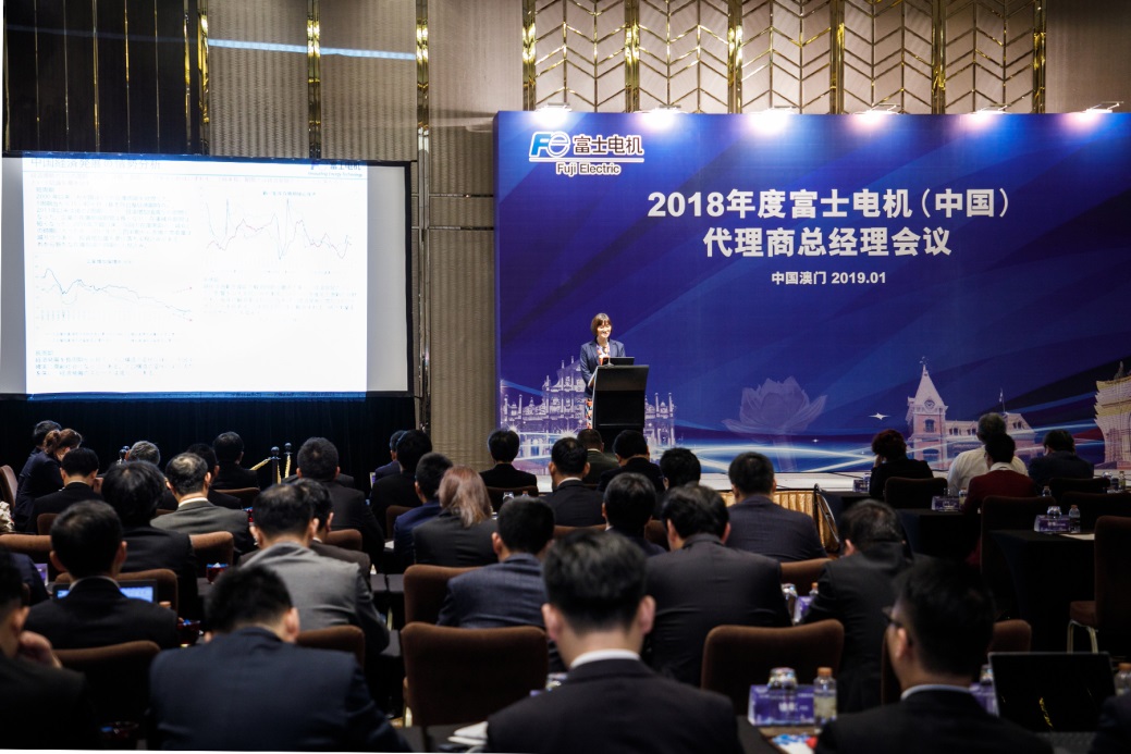 会议在富士电机日本株式会社铁谷副本部长以及富士电机(中国)有限公司千叶总经理的精彩致词之后拉开序幕。千叶总经理感谢了在场的各位优秀的代理商,因为有了大家的支持与信任富士电机(中国)才能实现稳步的上升。另外,公司也将持续改善现有项目,为全国的代理商提供最大的支持,无论2019年市场如何变化,我们有信心也有决心,相信乘风破浪会有时,与全国的代理商在新的一年实现“双赢”。