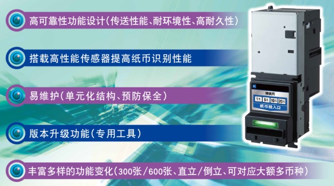 纸币识别器FGB系列是富士电机纸币识别器相关制品,拥有高可靠性功能设计(传送性能、耐环境性、高耐久性)、搭载高性能传感器提高纸币识别性能、易维护(单元化结构、预防保全)、版本升级功能(专用工具)、丰富多样的功能变化等特点,主要用于自动售货机、自助证件拍照机、停车场、报刊售货亭、车站、加油站。
